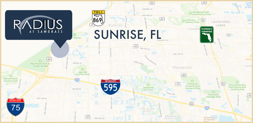 Radius’ unique location boasts direct access to I-75, via Sunrise Boulevard; I-595 via 136th Street; and Florida’s Turnpike and I-95 via 595.